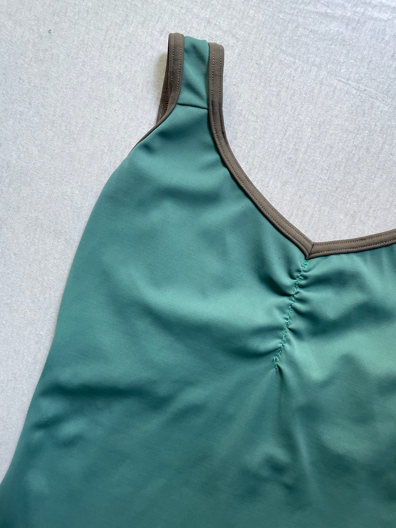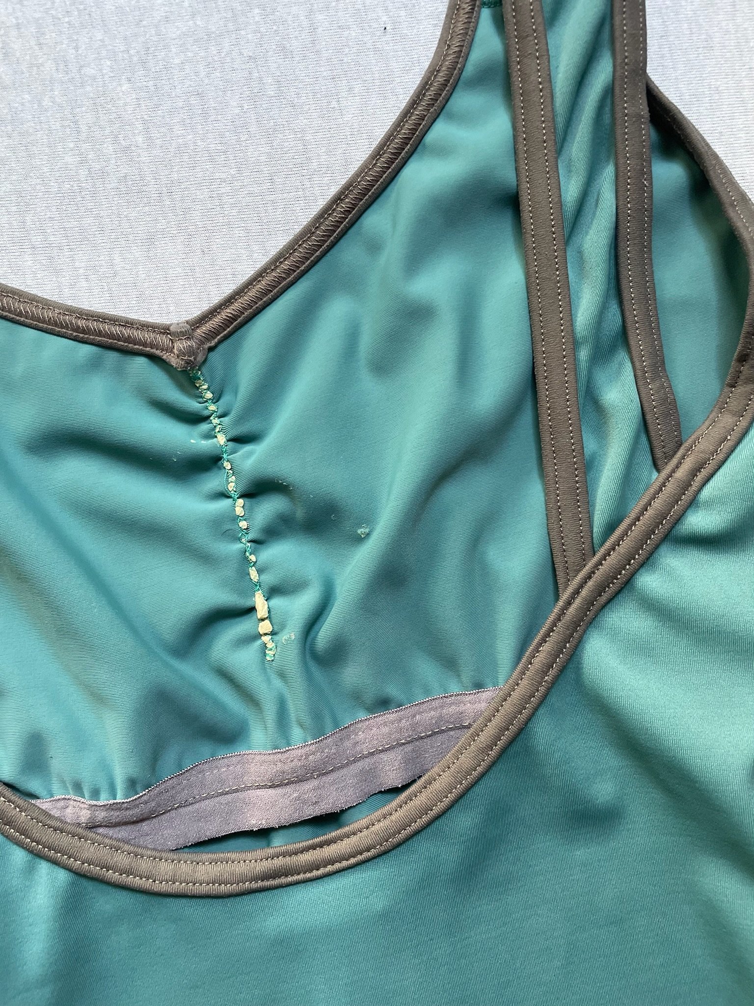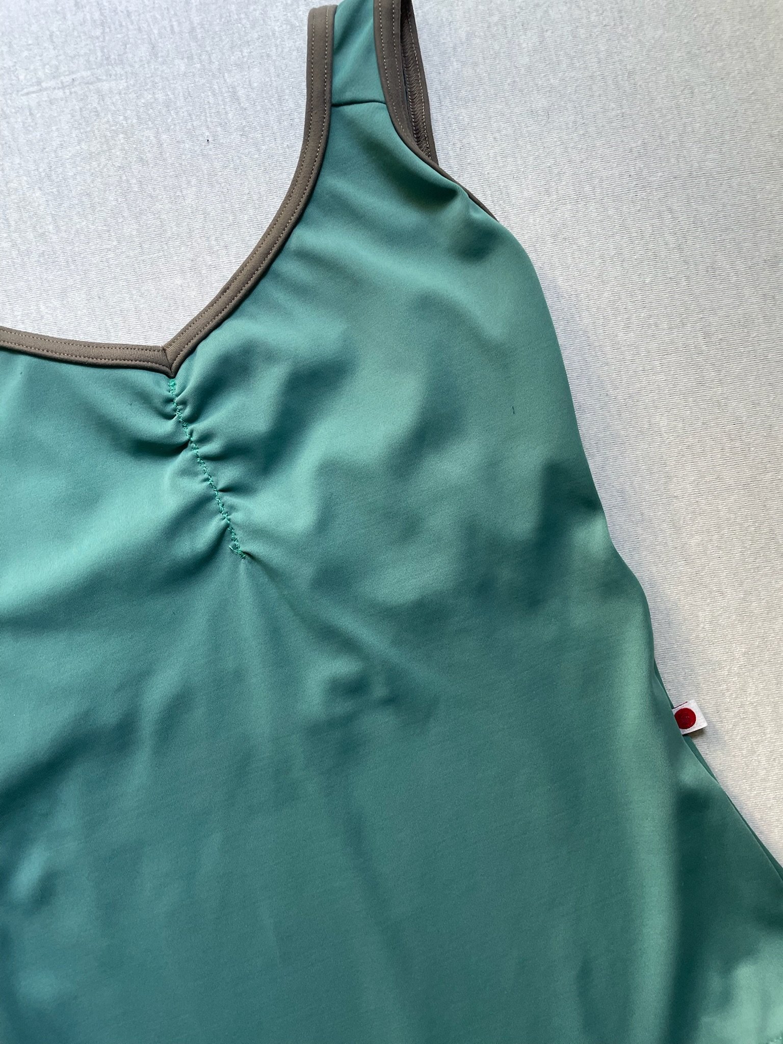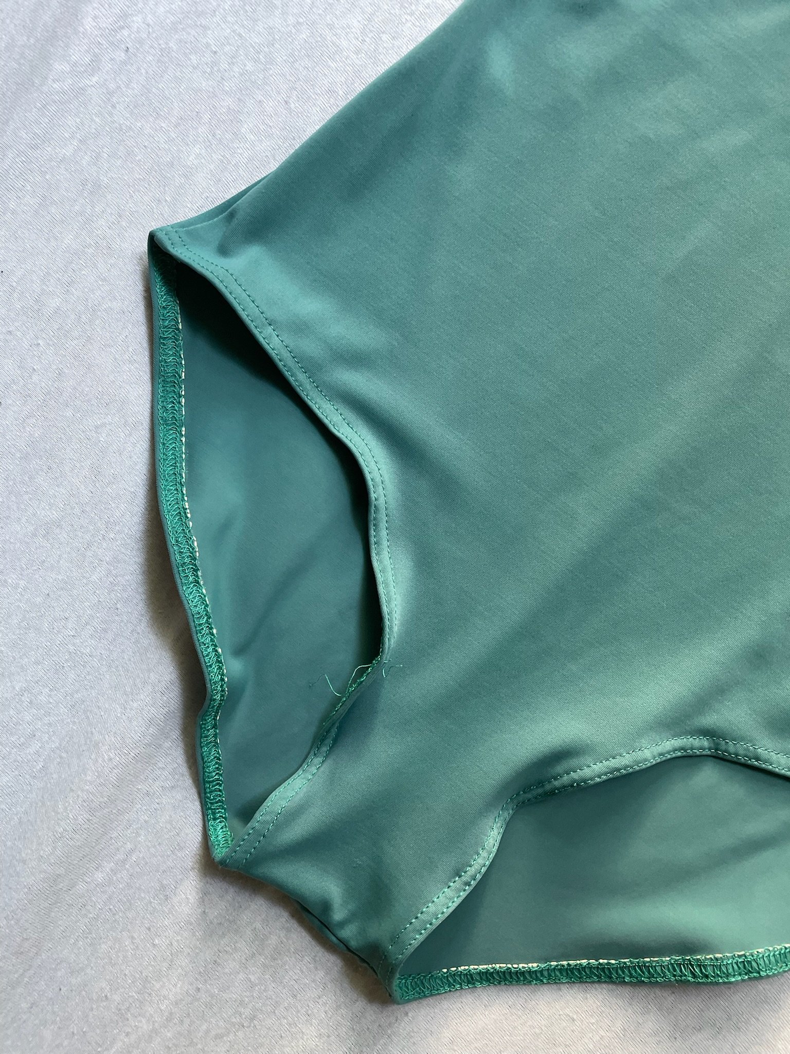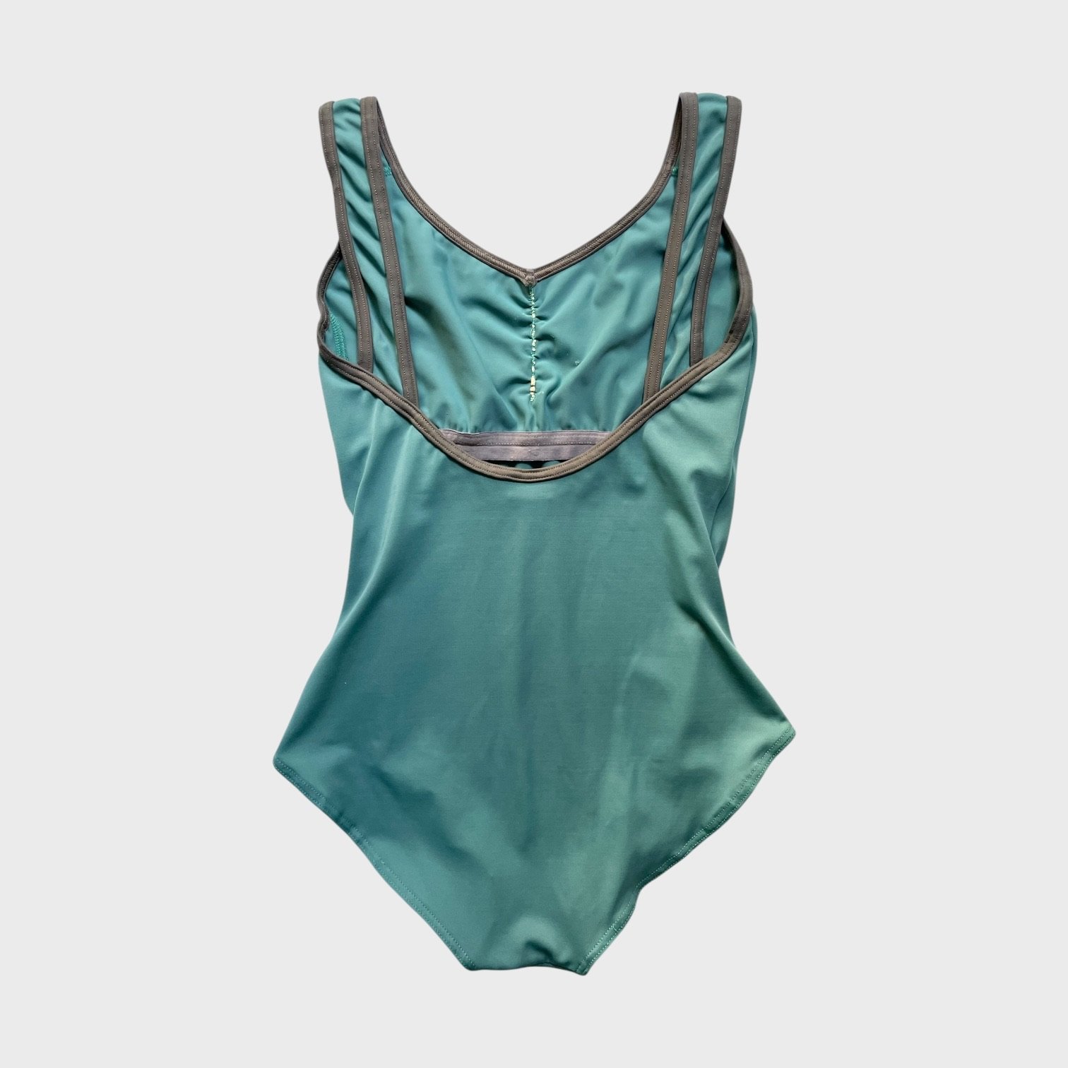 Yumiko Tiffany leotard in turquoise techni with grey trim and bust panel lining. Size S, poor condition – the elastics are hardened and have lost stretch.